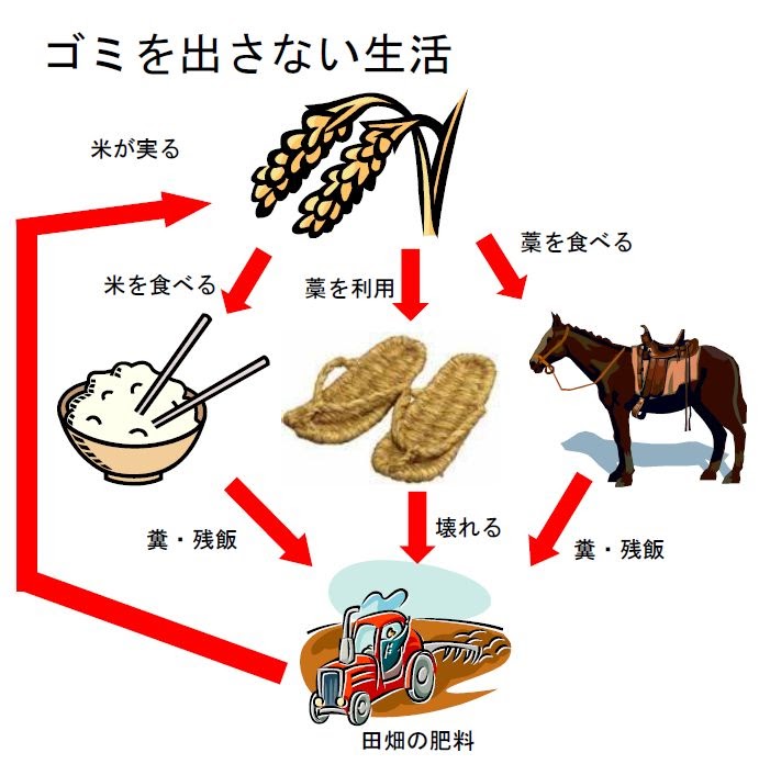使えなくなった道具やもみ殻、残飯、糞尿などは土に戻して肥料に使いました。古着やその他廃品回収、傘や釜をはじめとする修理屋が存在し、すべてのものを無駄なく再使用し、リサイクル生活をしていました。